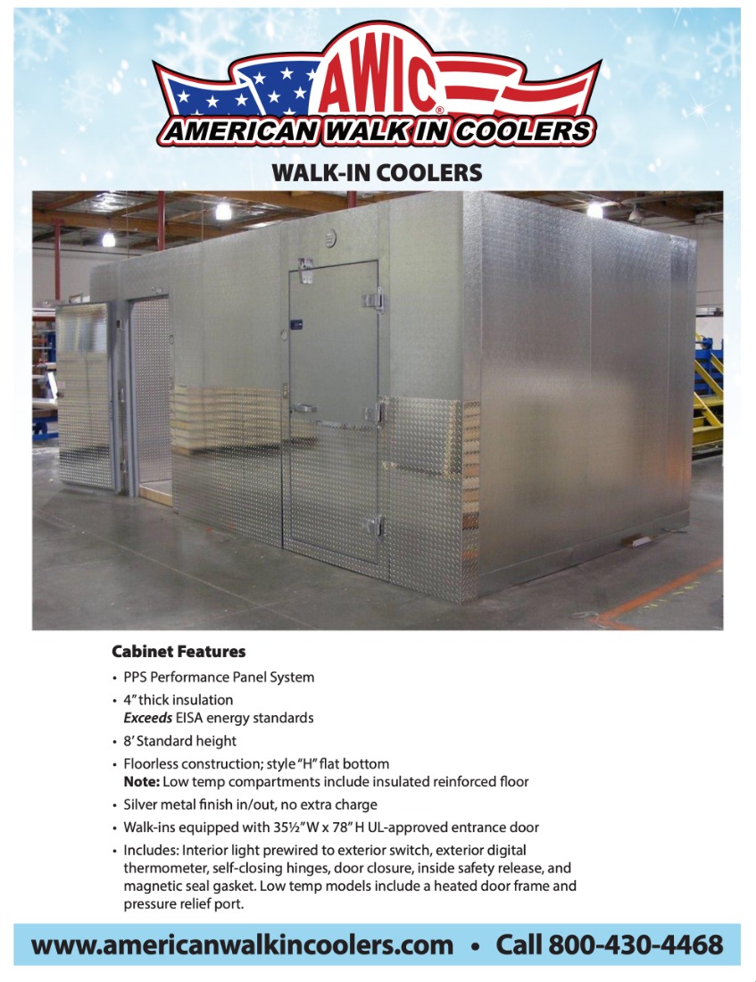 Interior light prewired to exterior switch, exterior digital thermometer, self-closing hinges, door closure, inside safety release, and magnetic seal gasket. Low-tempo door includes a heated door frame and pressure relief port.