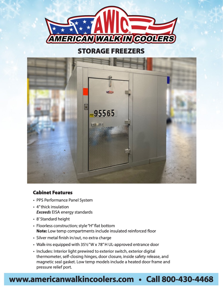 Interior light prewired to exterior switch, exterior digital thermometer, self-closing hinges, door closure, inside safety release, and magnetic seal gasket. Low-tempo door includes a heated door frame and pressure relief port. - (2) Wall trim strips
